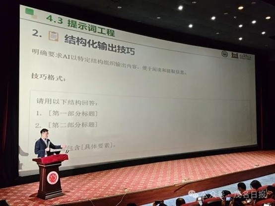 赵宝全副教授主要围绕如何借助DeepSeek提升政务办公效率进行讲解,他以通俗易懂的方式介绍了DeepSeek提问核心逻辑和提示词万能公式等,并且结合茂名本地特色政务办公场景,现场进行实操演示。此外,赵宝全副教授还分享了公共服务与沟通优化、AI综合应用拓展等内容。课程既有理论深度,又具备很强的实用性,现场观众表示受益匪浅。