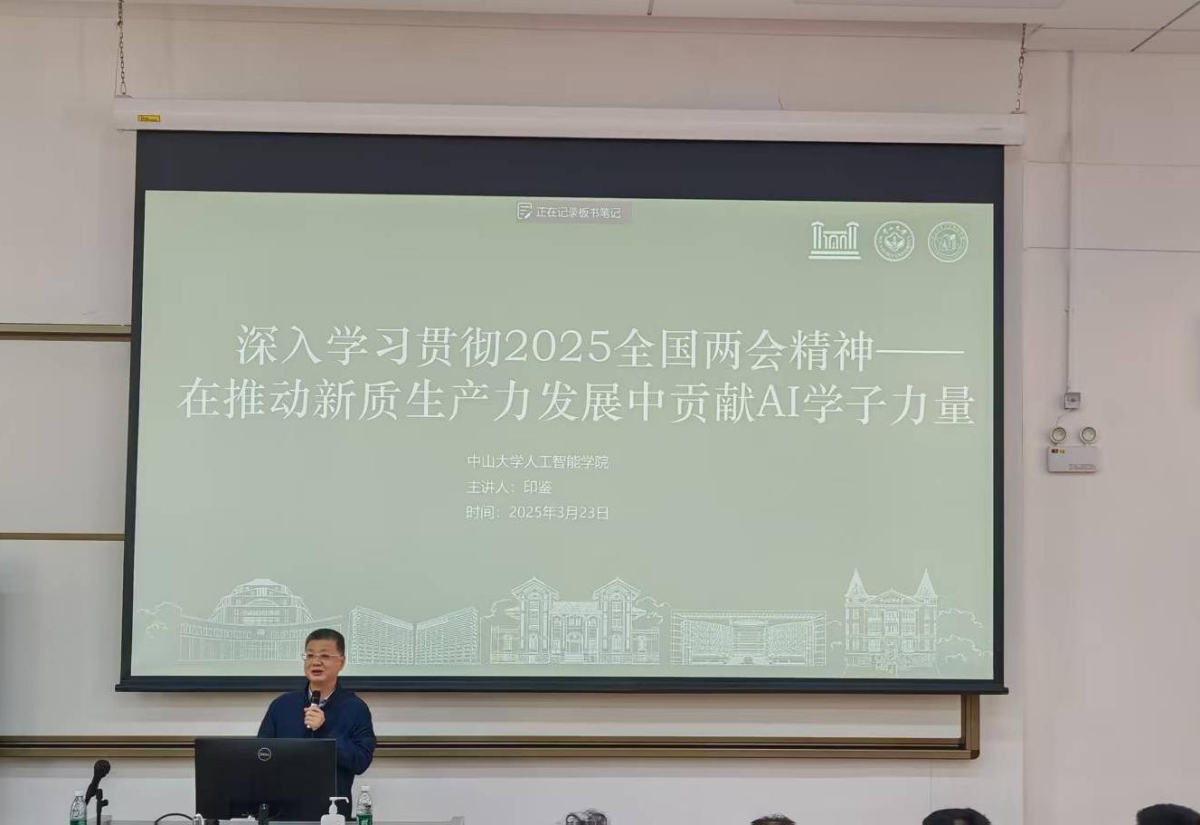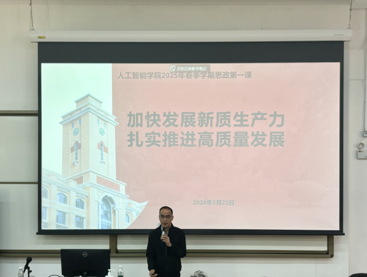 副院长(主持工作)印鉴教授以《深入学习贯彻2025全国两会精神——在推动新质生产力发展中贡献AI学子力量》为主题,紧扣2025年全国两会精神,聚焦人工智能领域发展前沿,为同学们讲授“思政第一课”。他以“新质生产力”为切入点,解读人工智能技术对工业智造、医疗、农业等领域的赋能实践,并高度肯定青年科研群体在算法创新、场景开发等方面的突破性成果,指出青年群体已成为新质生产力发展的生力军。面向未来,印院长号召学院学子以全国两会精神为指引,把握“AI+”时代机遇,在原始创新、产学研融合、自主技术生态构建中勇担重任,将个人理想融入国家战略需求,为推进新质生产力发展贡献青春力量。