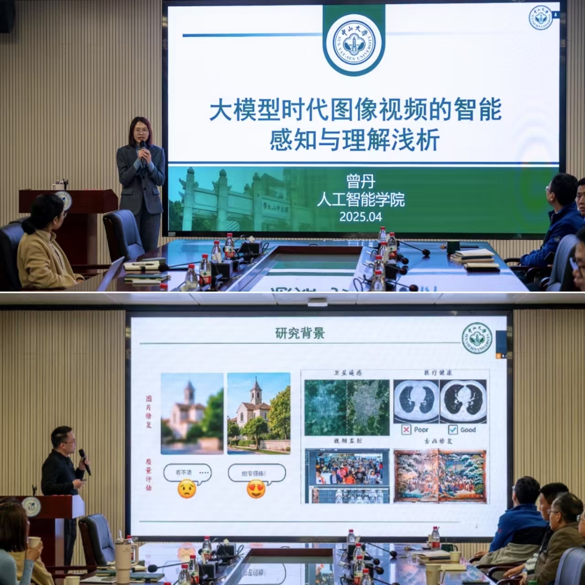 在学术交流环节中,曾丹副教授以《大模型时代图像视频的智能感知与理解浅析》为题,深入浅出地阐述了大模型技术在图像视频处理领域的革命性变革,并结合其团队的科研成果,探讨了文生视频与大姿态图像复原的前沿发展方向。陈超锋副教授以《图像修复和质量评估》为题,系统性地介绍了图像修复及其质量评估算法的最新研究成果及其应用前景。两位老师的报告内容充实、学术性强,充分体现了理论与实践相结合的重要性,促进了与会者之间的思考与交流。