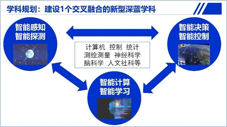 学院正在形成前沿性、交叉性、需求性的办学特色,已形成“1+3”总体发展规划:“1”指建设1个具有交叉融合特点的新型深蓝学科,其内涵主要包括计算机、控制、统计、神经科学、脑科学等学科;“3”指学院重点发展“智能感知与智能探测”、“智能计算与智能学习”、 “智能决策与智能控制”3个关键领域。