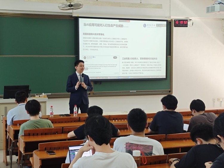 杨杰律师系统梳理我国人工智能产业从政策引导到法规落地的演进脉络,围绕“人工智能监管现状”、“AIGC合规趋势”、“生成内容著作权判定”、“AI技术滥用的社会风险”等热点话题展开,剖析了政策逻辑与企业合规路径。杨杰律师跟学生互动交流,并呼吁同学们,作为未来人工智能领域的从业者,希望大家能够不断提高法律约束上限,用更高的标准引领技术发展方向。