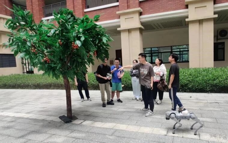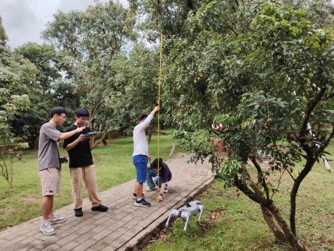 理论成果需要实践检验。今年4-5月,突击队指导老师王久珂教授带领成员在荔枝成熟收获前,三次前往高州市开展实地测试。果园复杂的地形环境给机器狗运行带来了一定挑战,松软的土壤、起伏的地面和低垂的枝条都影响着设备的正常运行。突击队队长区宏涛同学表示,“机器狗在平地上移动流畅,但在果园的实际环境中需要反复调试。”每次实地测试后,团队都会根据存在的问题并结合当地农业技术人员的建议,及时优化算法和调整机器狗的控制程序,逐步提升了模型在真实场景中的适应性。