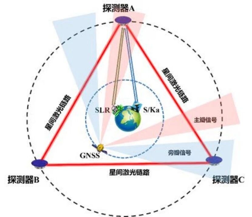▲天琴计划探测器多手段联合测定轨示意图